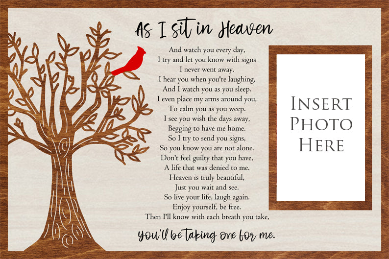 "As I Sit In Heaven" Poem: As I sit in Heaven And watch you every day, I try to let you know with signs I never went away. I hear you when you’re laughing And watch you as you sleep. I even place my arms around you To calm you as you weep. I see you wish the days away, Begging to have me home. So I try to send you signs, So you know you are not alone. Don’t feel guilty that you have Life that was denied to me. Heaven is truly beautiful. Just you wait and see. So live your life, laugh again, Enjoy yourself, be free. Then I know with Every breath you take. You’ll be taking one for me.